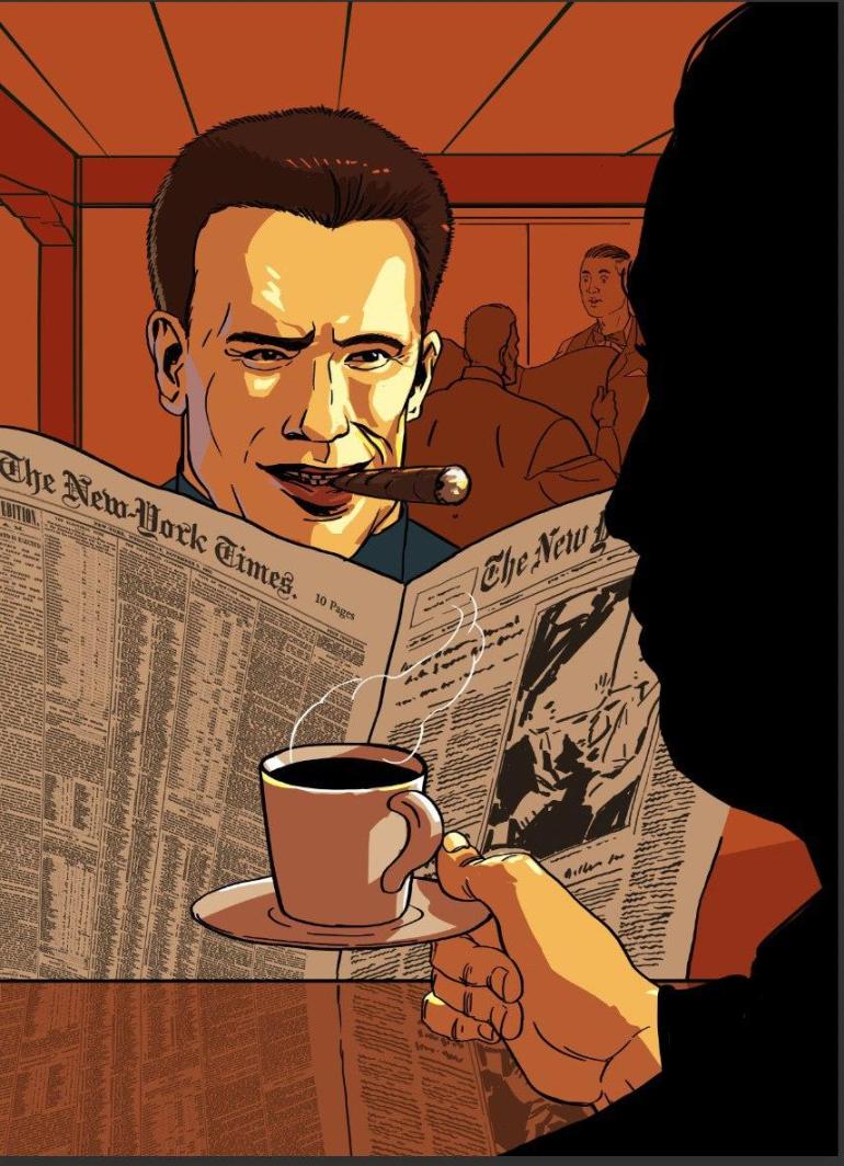 Гость был занят чтением газеты, в которую он был погружен настолько, что не было видно его лицо. Подойдя ближе, я заметил извивы дыма и уловил аромат дорогой сигары. Вдохнув его, я начал рисовать в своем воображении три разных образа таинственного незнакомца, скрывающегося за газетной ширмой.