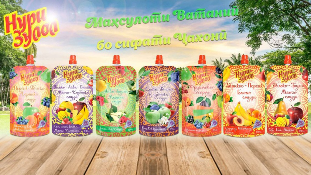 Недавно «Оби Зулол» расширила линейку своей продукции новыми пакетированными смузи и соками «НуриЗулол». Это продукты, представляющие собой различные миксы вкусов натуральных фруктов, выращенных в садах солнечного Таджикистана.
