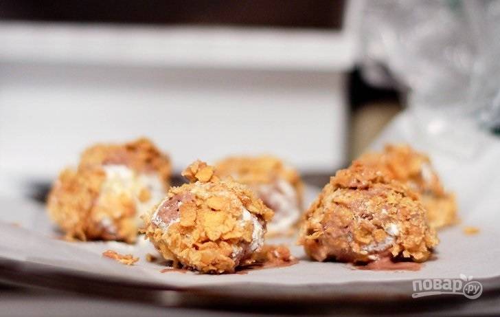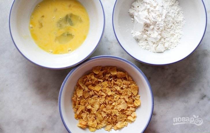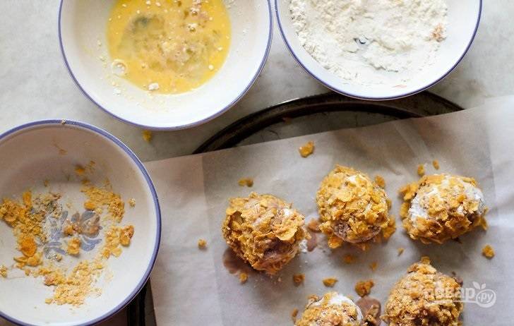 3. Каждый шарик окуните сначала в яйцо, а потом в муку. После снова в яйцо и затем — в кукурузные хлопья