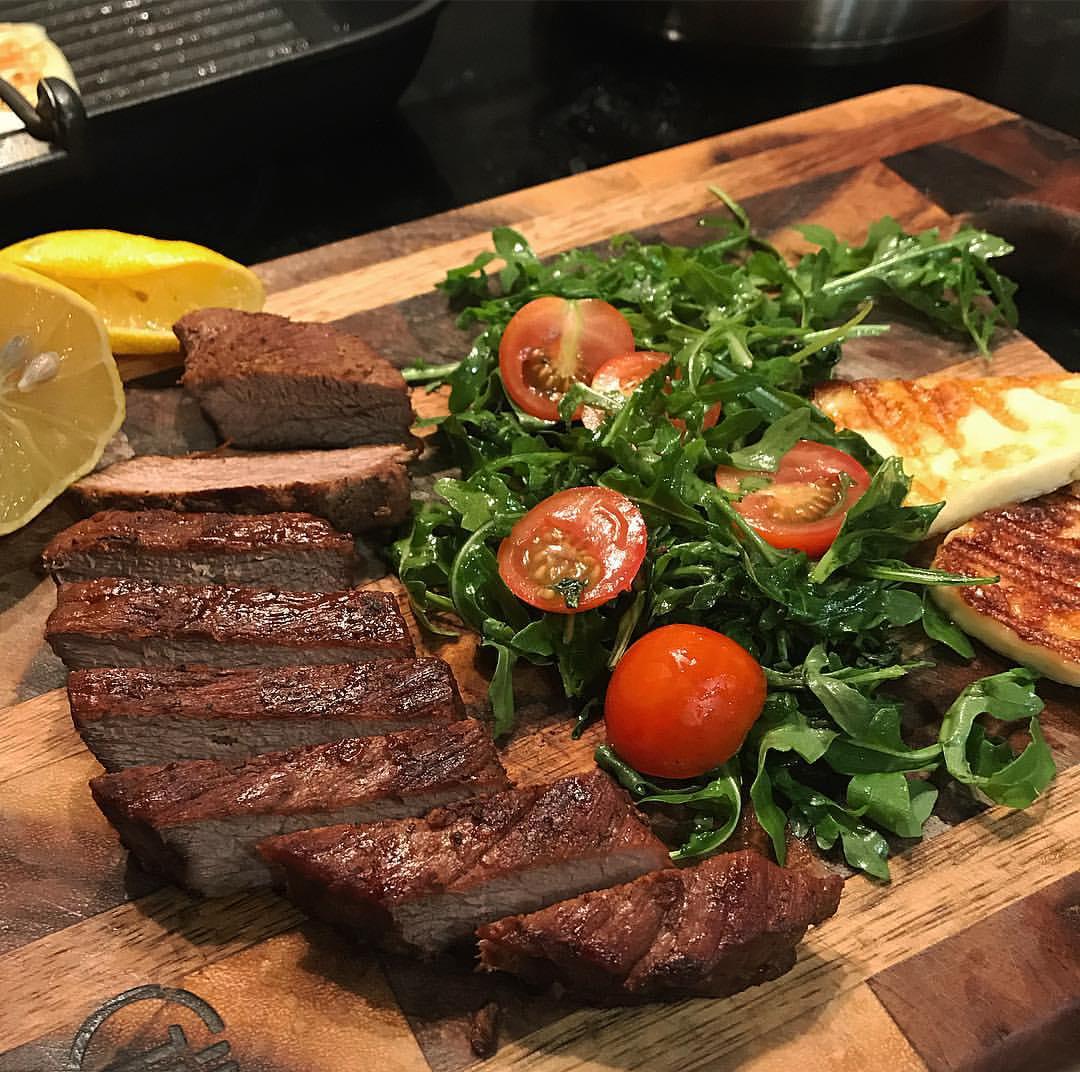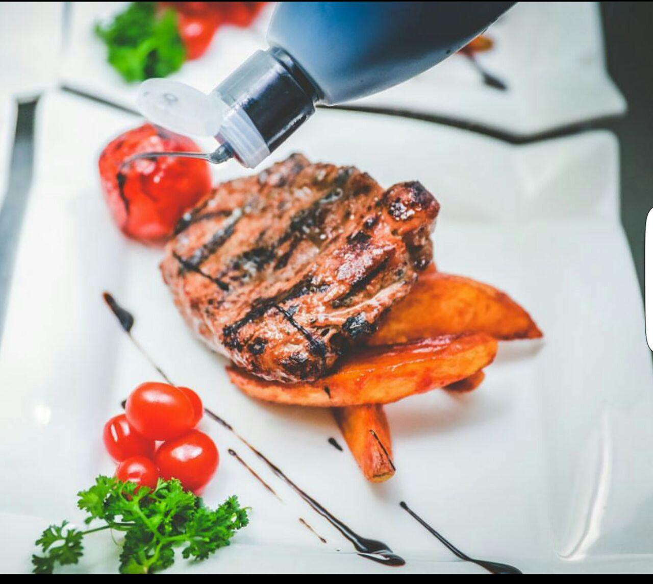 Весь секрет блюда в маринаде, а время прожарки стейков — всего 6 минут. Блюдо состоит из: 4 ломтиков мяса, 8 тонко нарезанных ломтиков помидоров, картошки, зелени и соуса. Ежедневно это блюдо в его ресторане заказывают по 30-35 порций.