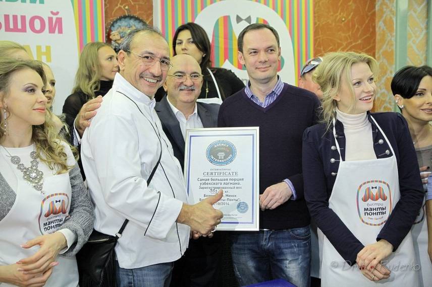 Самый большой лагман в мире приготовил шеф-повар из города Маргилан Хаким Ганиев. На него ушло более 1,5 центнеров мяса и овощей и более 1 килограмма лапши. Самый большой нарын весом в 500 килограмм тоже, как выяснилось, творение его рук.