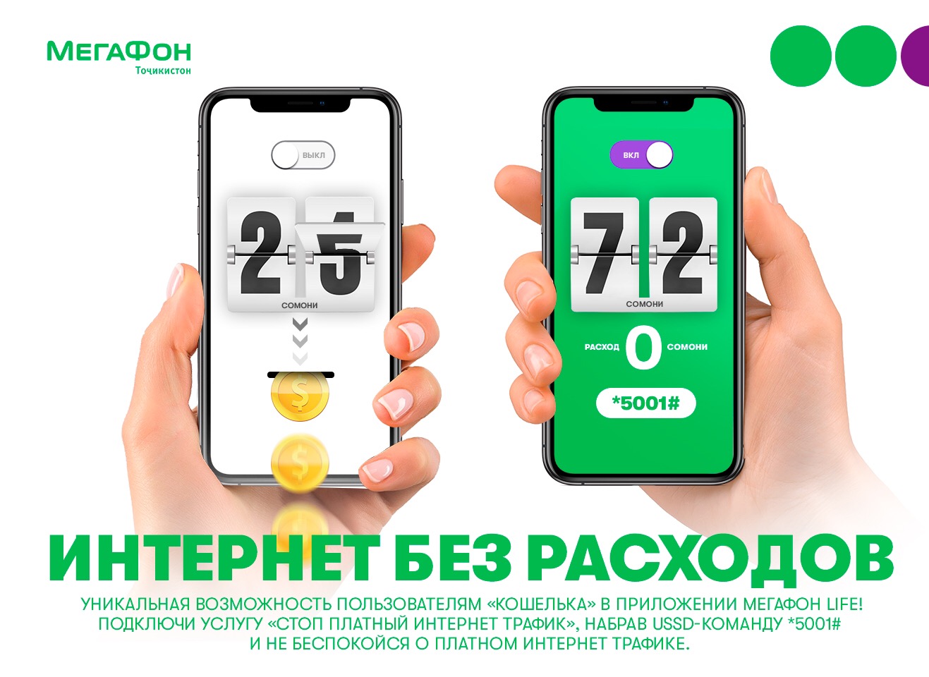 Для использования услуги «Стоп платный интернет-трафик» абоненту необходимо пользоваться «Кошельком» в приложении «МегаФон Life». Подключить новую услугу можно с помощью USSD-команды *5001# или в «Личном кабинете», также доступном через приложение «МегаФон Life». Услуга «Стоп платный интернет-трафик» предоставляется бесплатно.