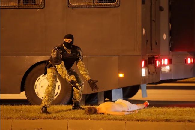 Эта фотография Василия Федосенко для агентства Reuters стала одним из самых известных кадров первой ночи протестов в Беларуси, пишет Медуза. Снимок был сделан в ночь с 9 на 10 августа возле стелы «Минск — город-герой», где проходили самые массовые задержания протестующих.