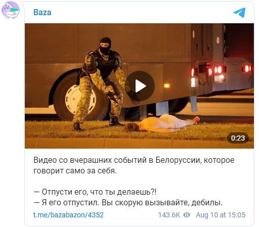 В интернете также появилась видеозапись этой сцены, ее выложил Onliner.by. На видео двое силовиков — один в балаклаве, другой в шлеме — выносят задержанного из автозака. Люди кричат им «Отпусти!» «Да я его отпустил! Вы скорую вызывайте!» — кричит в ответ силовик в балаклаве.