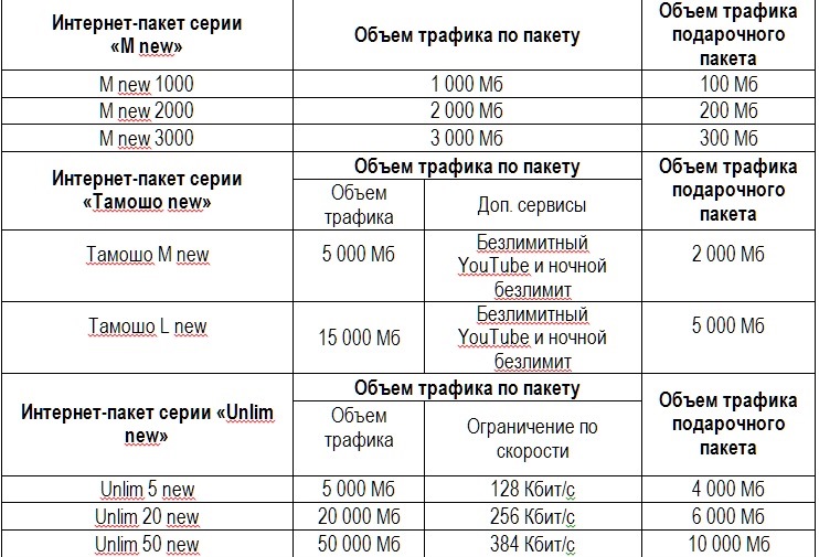 Объем трафика в подарочных пакетах – в таблице ниже.