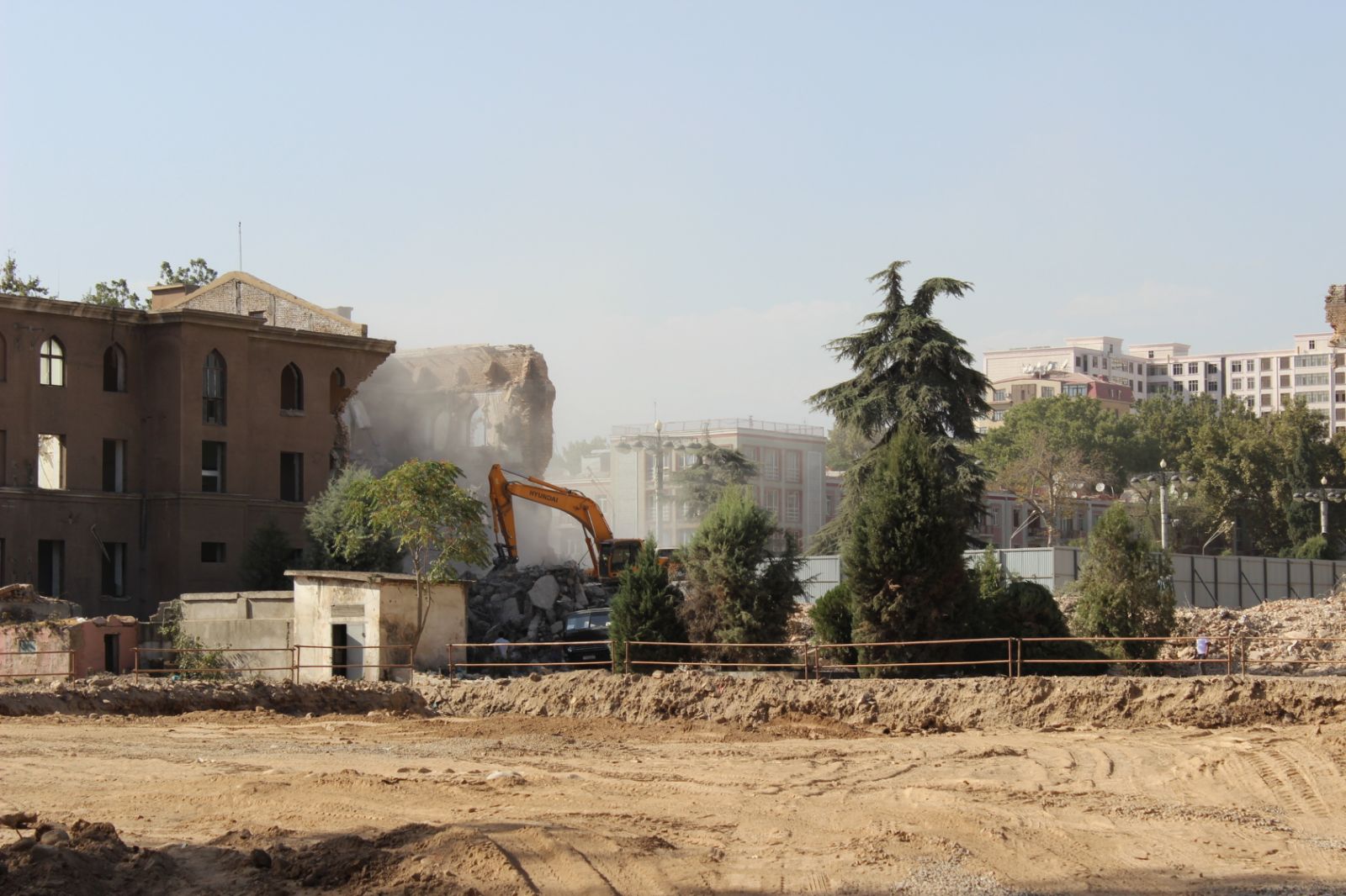 Уже снесены правое крыло здания и основное здание, расположенное в центре комплекса. На этом месте планируется построить новое здание правительства Таджикистана.