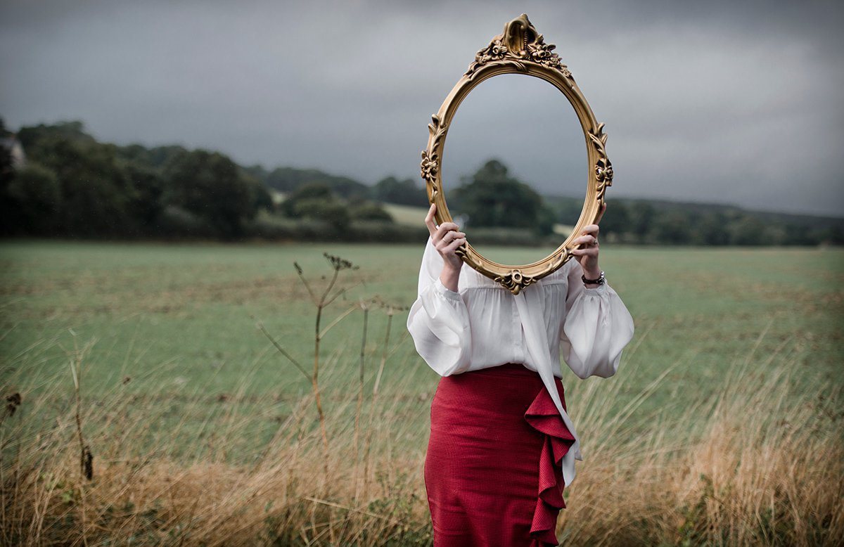 Фото с зеркалом в руках, когда какая-то часть тела закрыта и в отражении природа, здание, что угодно. Некая таинственность всегда интересна.