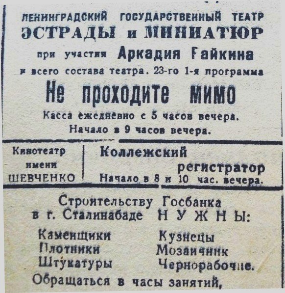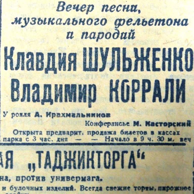 Летом 1941 г. в Душанбе, спасаясь от ужасов войны, стали прибывать из оккупированных немецкими войсками районов эшелоны с эвакуированными театральными коллективами. Среди них такие известные, как Ленинградский театр эстрады и миниатюр Аркадия Райкина, Московский Государственный цыганский театр «Ромен», Ленинградский театр комедии, Московский театр Красной Армии, Воронежский театр музыкальной комедии, Украинский театр им. Щорса, Днепропетровский кукольный театр, Государственный симфонический оркестр Украинской ССР. Все они выступали в летний театральный сезон под открытым небом Зеленного театра Сталинабада.