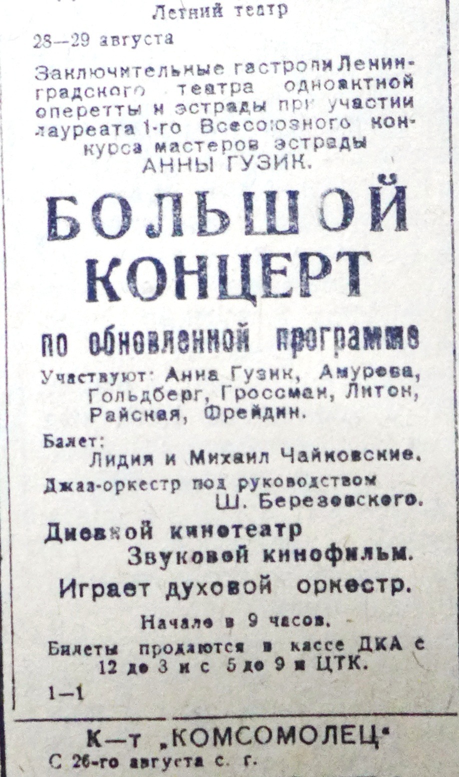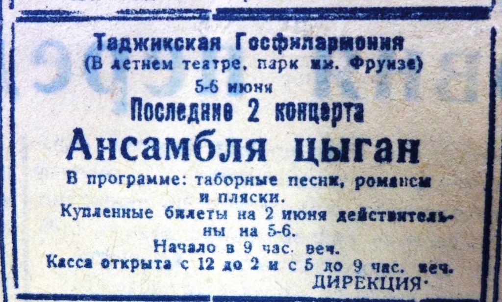 «Театр играл в так называемом Зеленом театре. Открытая сцена. Вокруг каналы с журчащей водой. После дневной жары от воды вокруг было прохладно. Ларьки были полны арбузами. Если бы не арыки и не деревья в три ряда между домами и узенькой полосой панели, было бы похоже на черноморские города. От ясного неба, фруктов, жары, вечерней музыки в парке было ощущение отпуска, каникул, праздника. Горы еще больше напоминали черноморское лето. Казалось, повернешь за угол – и увидишь море».
