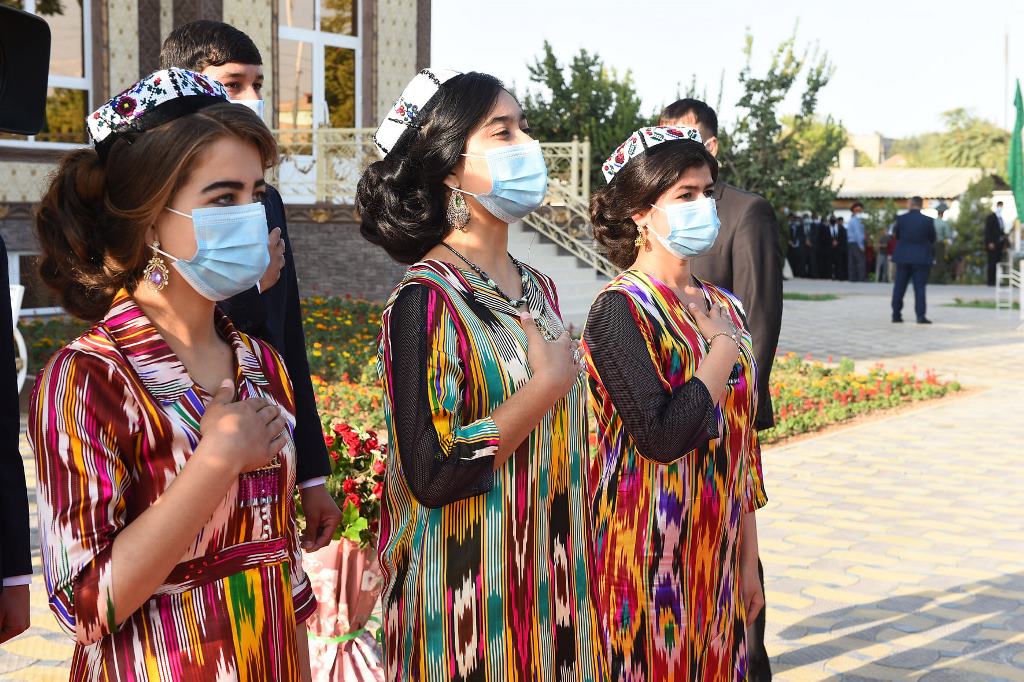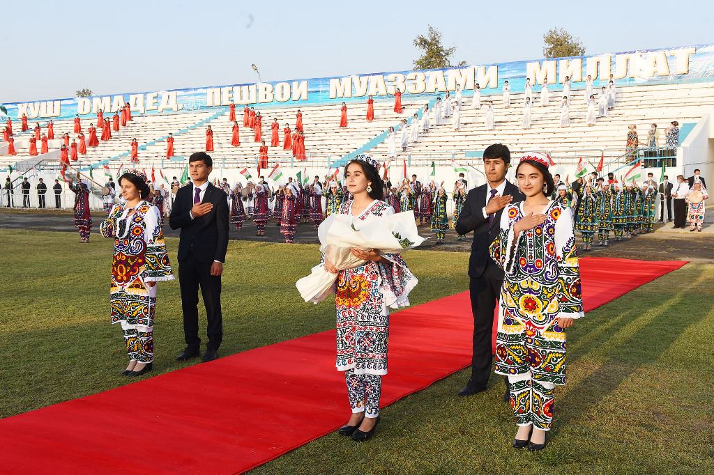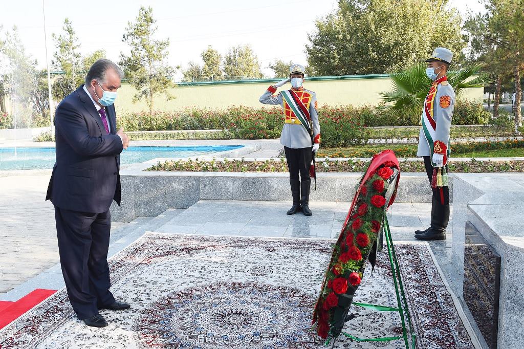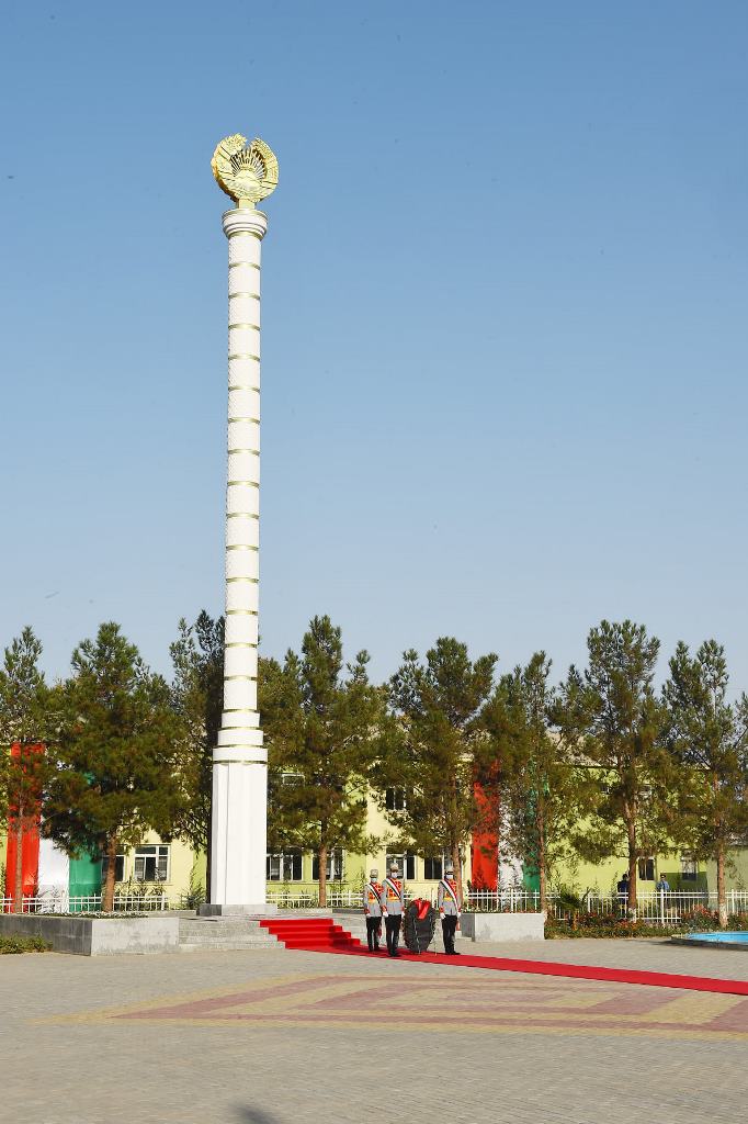 На площади Исмоили Сомони Шахритусского района в торжественной обстановке президент открыл главные символы государственности – Государственный флаг и Государственный герб.
