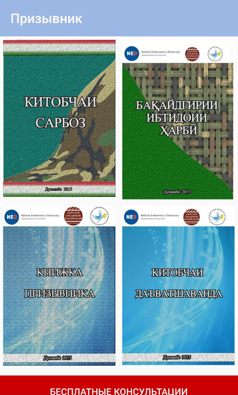 Также разработано 2 приложения на платформе Android, где можно найти всю необходимую информацию и связаться с юристом: «Призывник» и «Сборник книг по правам человека в сфере военной службы» на таджиксоки и русском языках. Приложение доступно к скачиванию в Play Market.