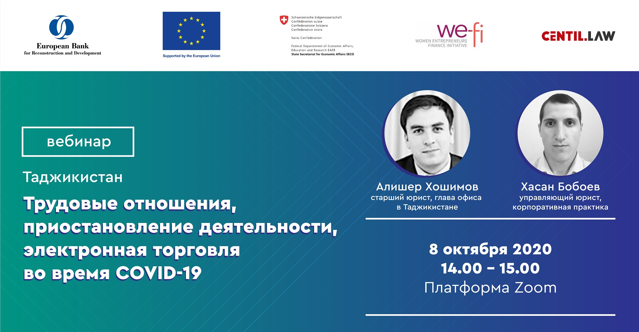 Европейский банк реконструкции и развития (ЕБРР) приглашает малые и средние предприятия принять участие в серии вебинаров, посвященных юридическим вопросам в сфере предпринимательской деятельности. Проведение вебинаров является частью проекта, реализуемого ЕБРР в партнерстве с юридической фирмой Centil. Партнерами проекта выступили Секретариат Консультативного совета и Торгово-промышленная палата Таджикистана.