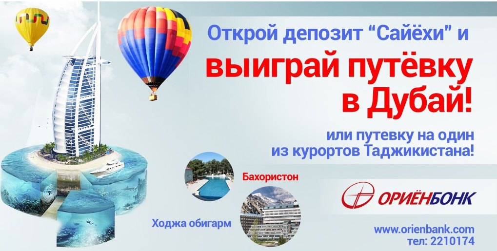 Преимущество срочного депозита «Сайёхи» в том, что клиент может не только получать процентный доход от банка, но и стать ежегодным участником розыгрыша, посвященного Международному дню туризма и выиграть один из подарочных путевок. У вас тоже есть шанс принять участие в акции, если вы откроете срочный депозит «Сайёхи» в Ориёнбанке.