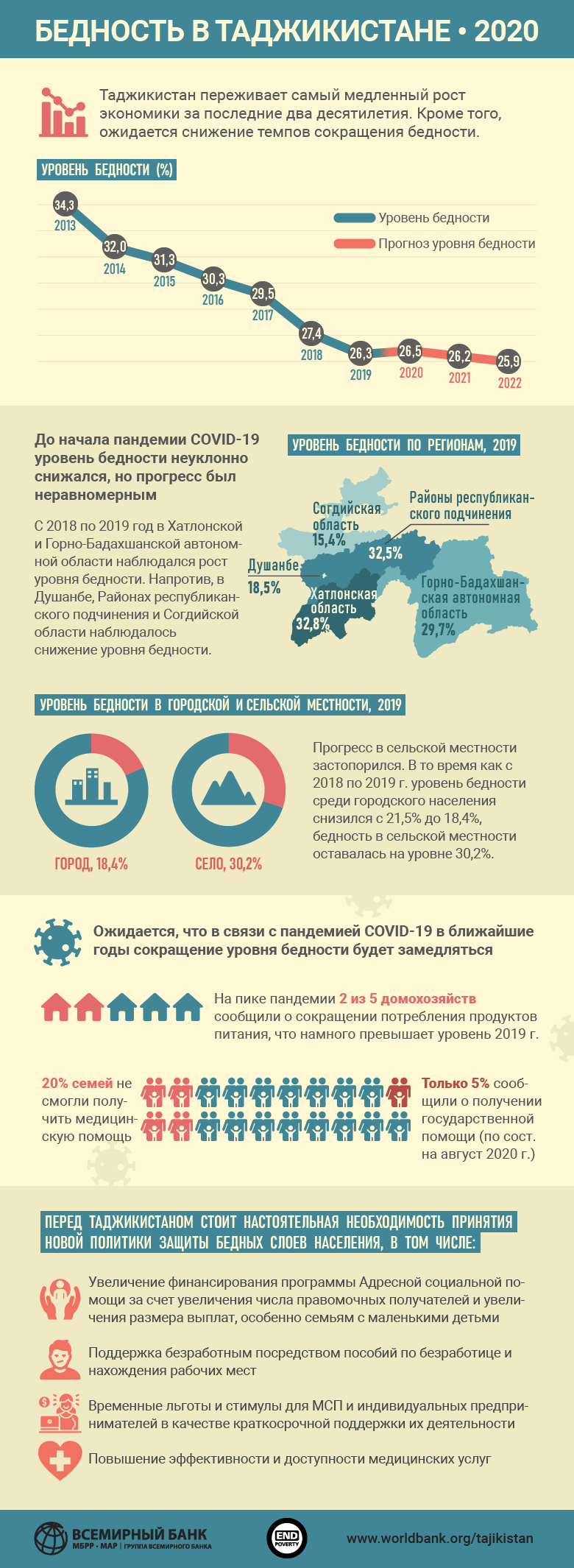 Всемирный банк прогнозирует небольшой рост уровня бедности в Таджикистане в нынешнем году. В подготовленной этим международным финансовым институтом графике говорится, что уровень бедности в республике увеличился с 26,3% в 2019 году до 26,5% в 2020 году.