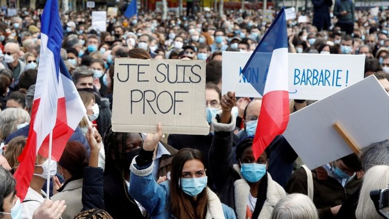 Президент Эммануэль Макрон заявил, что преподаватель погиб за то, что учил людей свободе выражения.