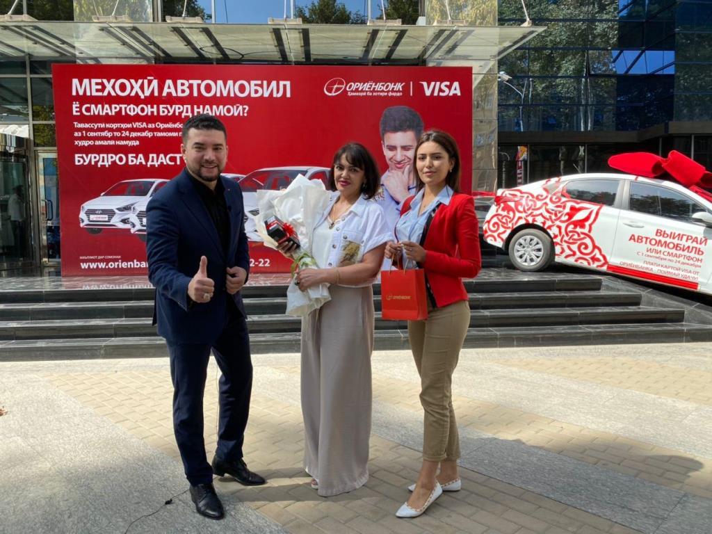 Шахноза Курбоншоева, которая на данный момент проходит обучение в Германии, всегда пользуется картой Visa от «Ориёнбанка» и стала обладательницей смартфона. Так как она находится за пределами республики, приз вручили ее маме.