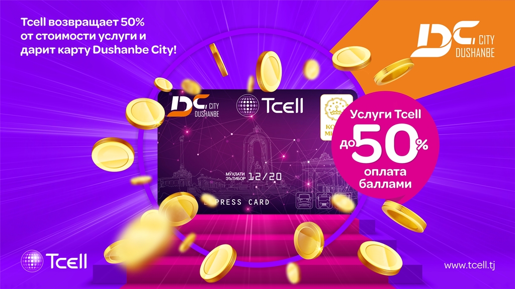 Ведущий инновационный оператор страны – компания Tcell и Dushanbe City представляют абонентам уникальное предложение: оплачивайте абонентскую плату за тариф и получайте 50% от стоимости услуги на кобрендинговую карту Tcell и Dushanbe City которую Вы получите в подарок.
