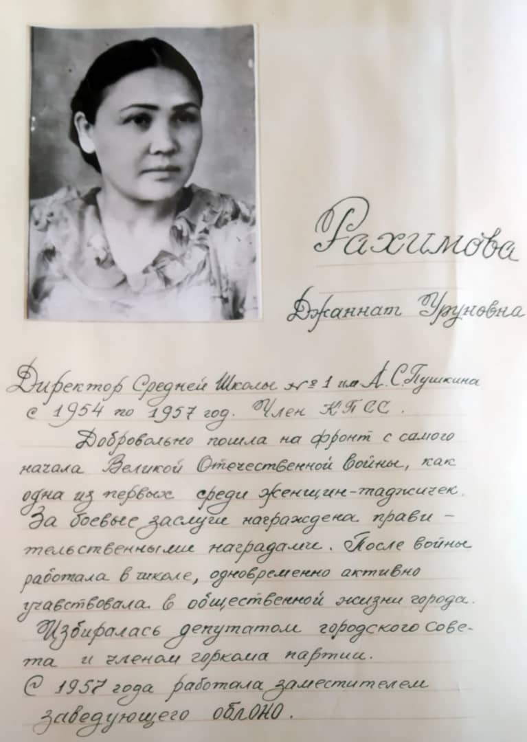 — По рассказам моей бабушки, в этой школе училась наша родственница Джаннат Рахимова, которая одна из первых женщин-таджичек ушла на фронт, — рассказывает Муяссар Акилова, учитель русского языка. – Позже, в 1954 году она станет директором этой школы. Знание нескольких иностранных языков, которые она получила во время учебы, позволили ей дойти до Берлина, работать снайпером, быть переводчиком.