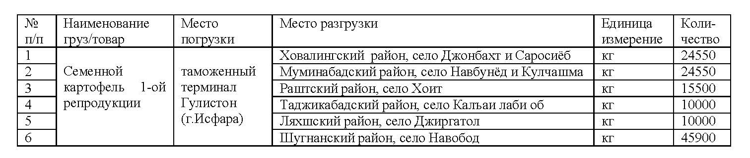 Программа поддержки развития обществ горных регионов (ППРОГР) — проект Фонда Ага Хана в Таджикистане, в рамках проектов по обеспечению продовольственной безопасности и воздействия на последствия СOVID-19, приглашает всех заинтересованные, правомочные лица подать заявки в запечатанных конвертах или в электронном виде на оказание услуг по перевозке 130,5 тонн семенного картофеля автотранспортом по следующим маршрутам: