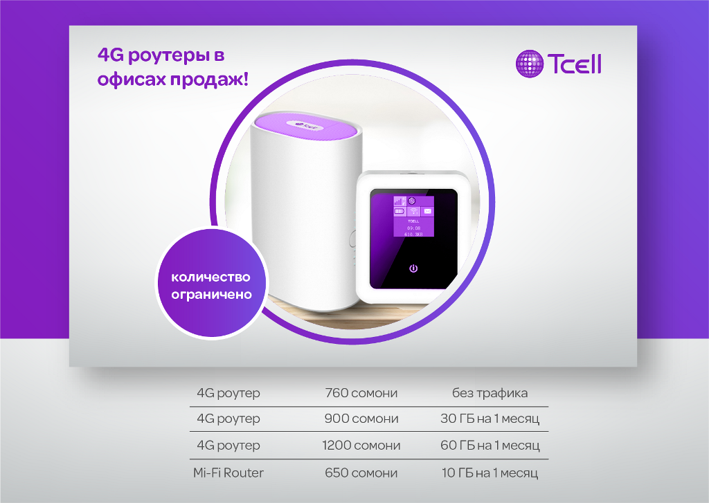 Ведущий инновационный оператор страны – компания Tcell, представляет возможность приобретать 4G и Mi-Fi роутеры в центрах обслуживания абонентов по стране.
