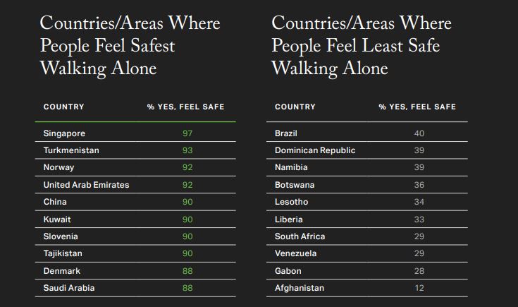 Наиболее же небезопасными по этому критерию признаны Афганистан (12%), Габон (28%) и Венесуэла и ЮАР (по 29%).