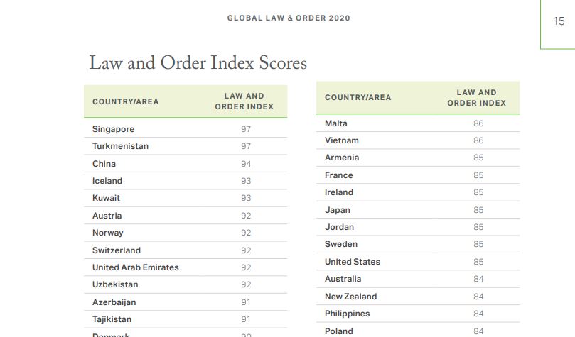 Исследование 2020 Global Law and Order содержит 144 стран и территорий мира, рейтинг составлен на основе проведенного в 2019 году опроса среди жителей этих стран.