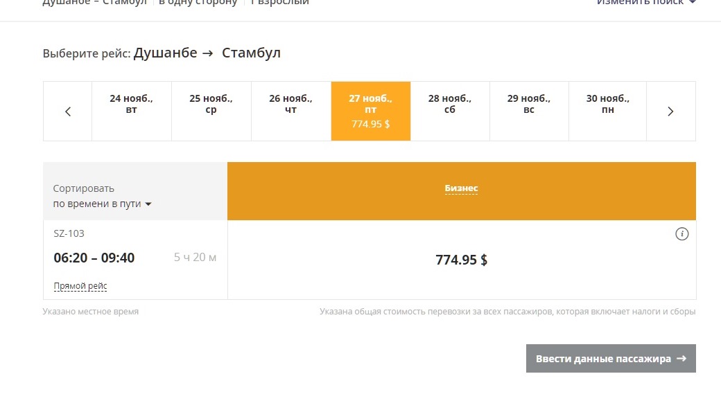 Ближайший рейс запланирован на 20 ноября, на который уже нет билетов в продаже. Следующий рейс запланирован на 27 ноября. На сайте компании отмечается, что время в пути займет 5 часов 20 минут, а цена на билет в бизнес – класс составляет 8758,20 сомони ($774, 95).