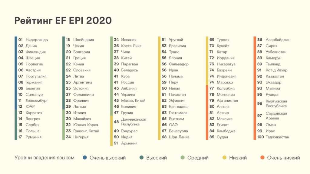 Индекс уровня владения английским языком EF (EF EPI) – это самый полный рейтинг стран по уровню английского языка у взрослого населения. Индекс EF EPI публикуется ежегодно и является важным международным показателем владения английским языком среди взрослого населения.