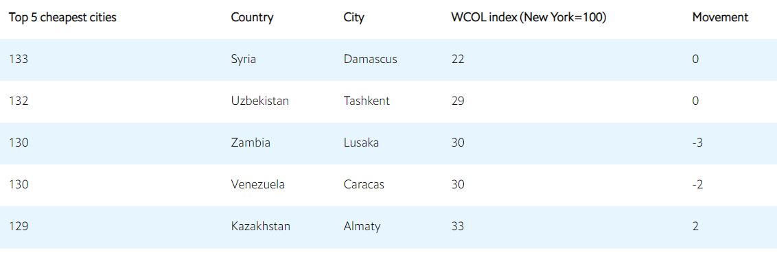 Дешевле Ташкента жить можно только в Дамаске (столица Сирии). Далее следуют Лусака (столица Замбии), Каракас (столица Венесуэлы) и Алматы.