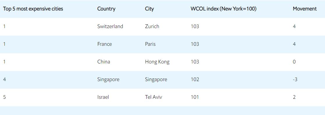 В пятерку наиболее дорогих городов также вошли Париж (Франция), Гонконг (Китай), Сингапур и Тель-Авив (Израиль).