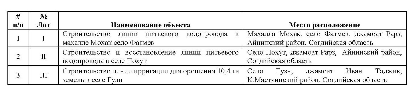 Программа Поддержки Развития Обществ Горных Регионов (ППРОГР) — проект Фонда Ага Хана в Таджикистане, в рамках реализации проекта «Улучшение средств к существованию и продовольственной безопасности через устойчивое управление природными ресурсами (NRM)», приглашает всех заинтересованных, правомочных лиц подать заявки в запечатанных конвертах на выполнение следующих строительных работ: