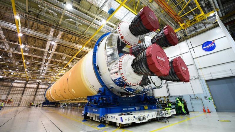 Американское космическое агентство НАСА начало собирать гигантскую ракету-носитель Space Launch System (SLS), которая в будущем должна обеспечить доставку астронавтов на Луну. Первый полет этой системы состоится в следующем году, передает ВВС.