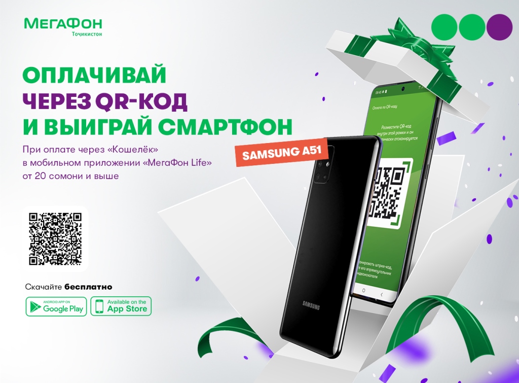 Абоненты компании «МегаФон Таджикистан» могут претендовать на ценный приз – смартфон Samsung Galaxy A51. Получать ID-номера для участия в акции можно при совершении любых покупок на сумму от 20 сомони и более с помощью QR-кодов в «Кошельке» мобильного приложения «МегаФон Life».