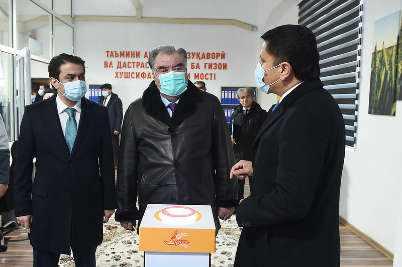 Президент Таджикистана Эмомали Рахмон и мэр Душанбе Рустам Эмомали сегодня приняли участие в церемонии сдачи в эксплуатацию ООО «Душанбинский мукомольный комбинат» после реконструкции.