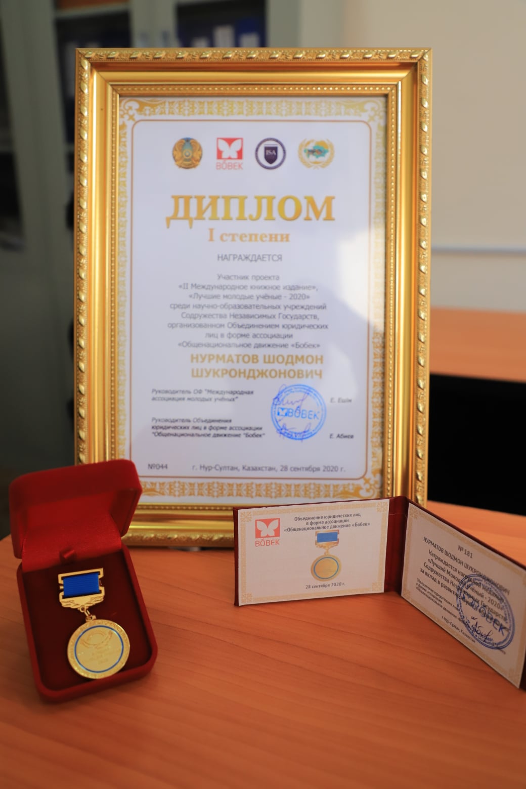 Посланные победителю из города Нур-Султана Республики Казахстан награды — Диплом первой степени среди научно-образовательных учреждений СНГ, нагрудную медаль «Лучший молодой ученый – 2020» за вклад в развитие науки и образования и свидетельство, накануне, Шодмону Нурматову вручил ректор Худжандского госуниверситета, доктор исторических наук Джамшед Джуразода.