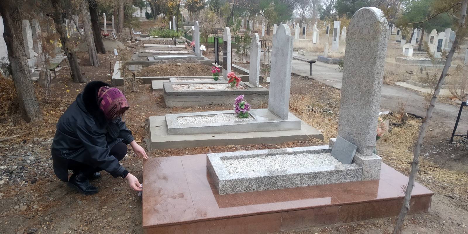 Кладбище на окраине Бустона в Согдийской области. Альфия приходит сюда навестить родных – маму, брата и сына. Протирает от пыли могильный памятник, собирает опавшую листву, заменяет увядшие цветы на свежие. Сторож привык к ее частым визитам, и всегда встречает женщину добрым приветствием.