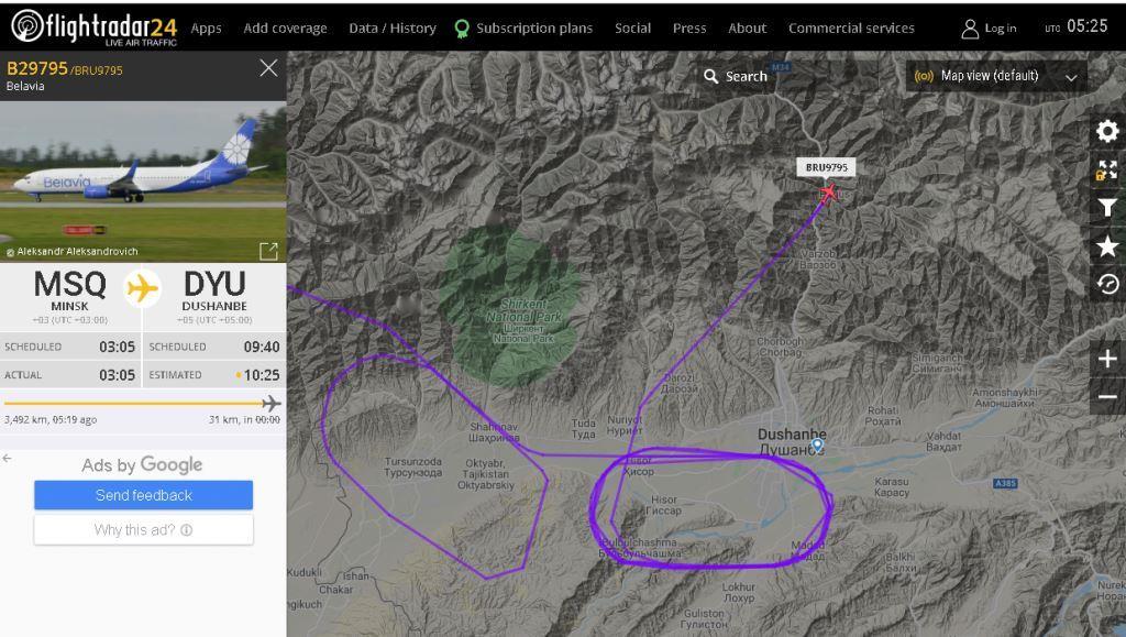 Читатель "Азия-Плюс" Бахтиёр Кадыров прислал в редакцую скриншоты с сайта Flightradar, где видно, что самолёт Belavia airlines, который должен был приземлиться в аэропорту Душанбе в 09:40, не смог приземлится в МАД Душанбе и после нескольких кругов над Душанбе направился в аэропорт Ташкента.