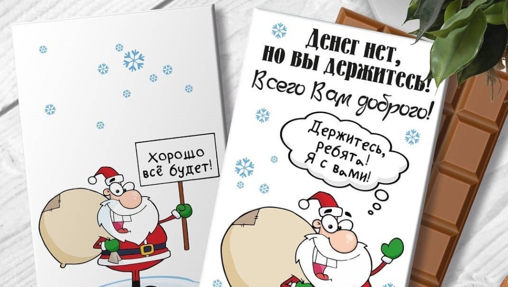 Приобрести можно шоколадные шарики в виде ёлочных игрушек, ассорти из нескольких конфет, шоколадные раскраски для детей и даже новогоднюю открытку с изображением советских героев.