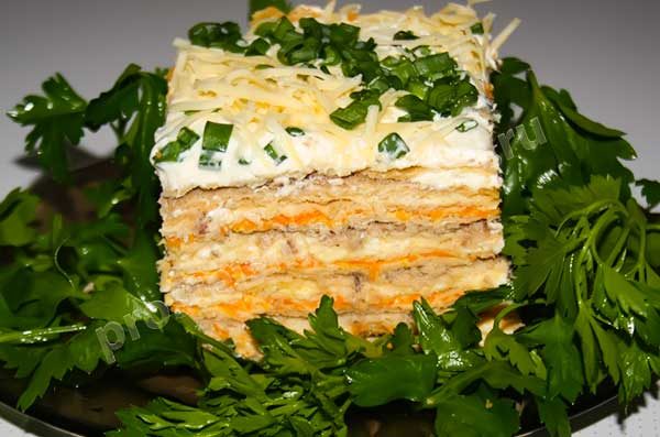 Собираем торт: на первый корж укладываем размятую рыбу и промазываем майонезом, на второй – смесь моркови, яиц и сыра. Чередуем начинку, а сверху и по бокам промазываем наш торт майонезом, и присыпаем тертым сыром. Украшаем творение оливками, петрушкой и грецкими орехами так, как подскажет фантазия. Теперь можно отправить торт в холодильник на несколько часов, чтобы он как следует пропитался.