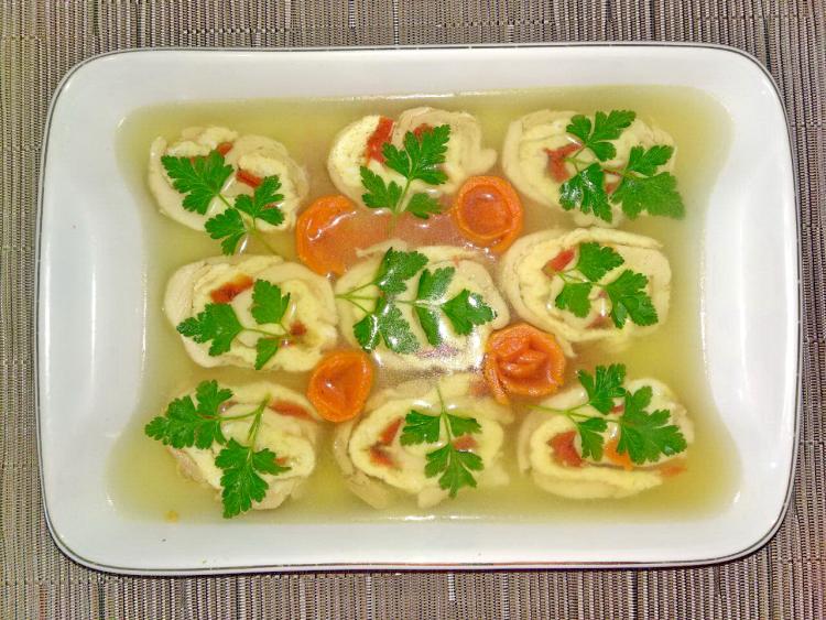 В бульон добавляем сок лимона, желатин и чеснок, затем заливаем наши рулетики, и отправляем в холод для застывания. Готовое заливное переворачиваем на красивое блюдо, нарезаем порционными кусочками. Теперь оно готово стать украшением праздничного стола.