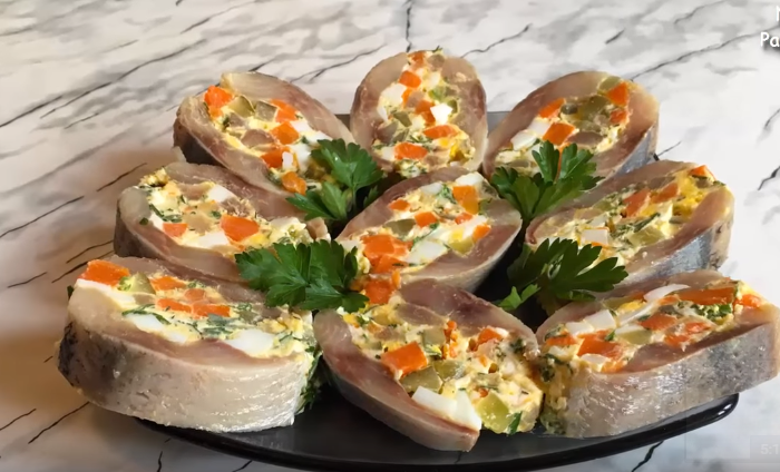 Это интересное и вкусное блюдо, которое прекрасно будет смотреться на новогоднем столе. С начинкой можно экспериментировать, но лучше всего использовать консервированный горошек, отварную морковь, яйца и маслины. Чтобы рыба и начинка не теряли форму, следует пропитать сельдь желатином, и добавить его в майонез.