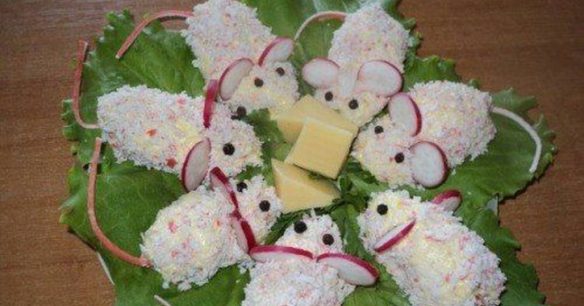 Теперь несколько вытягиваем наши шарики, придавая им форму мышек. Носик и глазки делаем из горошин перца, из редиса ушки, а из крабовых полосочек хвостики. Для красоты, мышек можно посадить на листья салата.