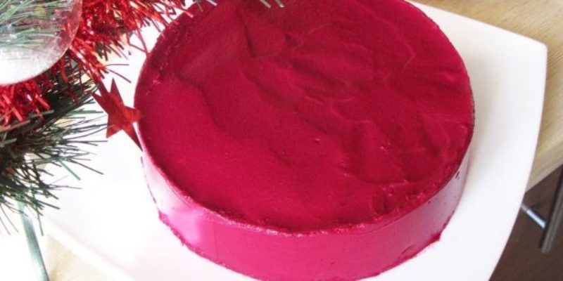 Все ингредиенты надо подготовить в соответствии с классическим рецептом. Далее желатин заливают 70–100 мл холодной воды. На блюдо ставят разъёмную форму диаметром 16 см и выкладывают слои, единственное дополнение – варёную свеклу надо измельчить блендером, добавив 2–3 столовые ложки майонеза. Замоченный желатин разогревают и вливают в блюдо. Теперь его вновь надо взбить блендером до однородной кремовой консистенции. С салата снимают форму на 16 см и ставят форму диаметром 18 см. Верх и бока салата надо залить свекольной массой и хорошо разровнять. Теперь блюдо надо убрать на ночь в холодильник, а перед подачей на следующий день с салата надо снять кольцо.