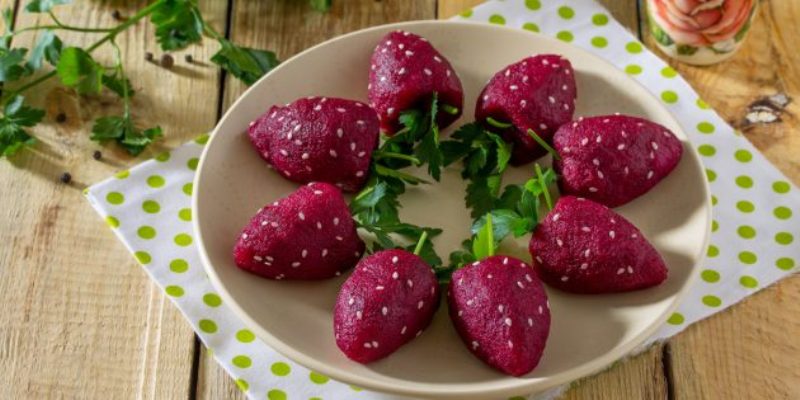 Свеклу и картошку чистят от кожуры и отваривают. Свеклу натирают на мелкой терке и отжимают, после чего картошку превращают в пюре, добавляют овощи и слегка солят. Селедку и лук режут мелкими кубиками и смешивают с рубленым укропом. Далее из овощного пюре лепят небольшие лепешечки. В каждую из них на середину выкладывают смесь из селедки, лука и укропа и формируют клубники. Готовые формы смазывают смесью лимонного сока и масла, в качестве семечек берут кунжут, а листиков – петрушку. Чтобы клубники с селедкой было удобнее есть, их можно уложить на кусочки чёрного хлеба.