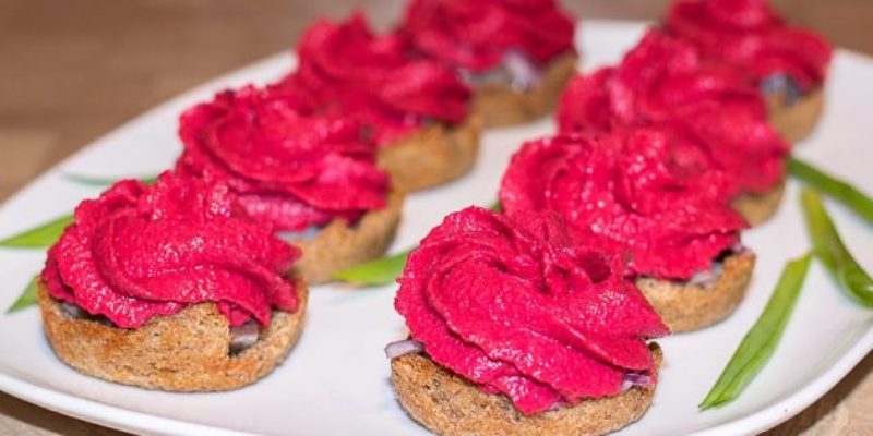 Свеклу и морковь варят, чистят от кожуры и превращают в пюре блендером до однородной консистенции вместе со сливочным сыром. Готовую массу выкладывают в кондитерский мешок и убирают в холодильник. Тем временем надо подготовить тарталетки: у каждого ломтика хлеба отрезают корки, форму для приготовления кексов смазывают маслом и плотно укладывают хлеб на дно каждой формы. Тарталетки готовят 10 минут в духовке при 200 °C. Теперь надо нарезать селедку средними кубиками, а лук — четвертинками колец. В каждую готовую тарталетку выкладывают слой за слоем: рыбу – лук – пюре и подают на стол.