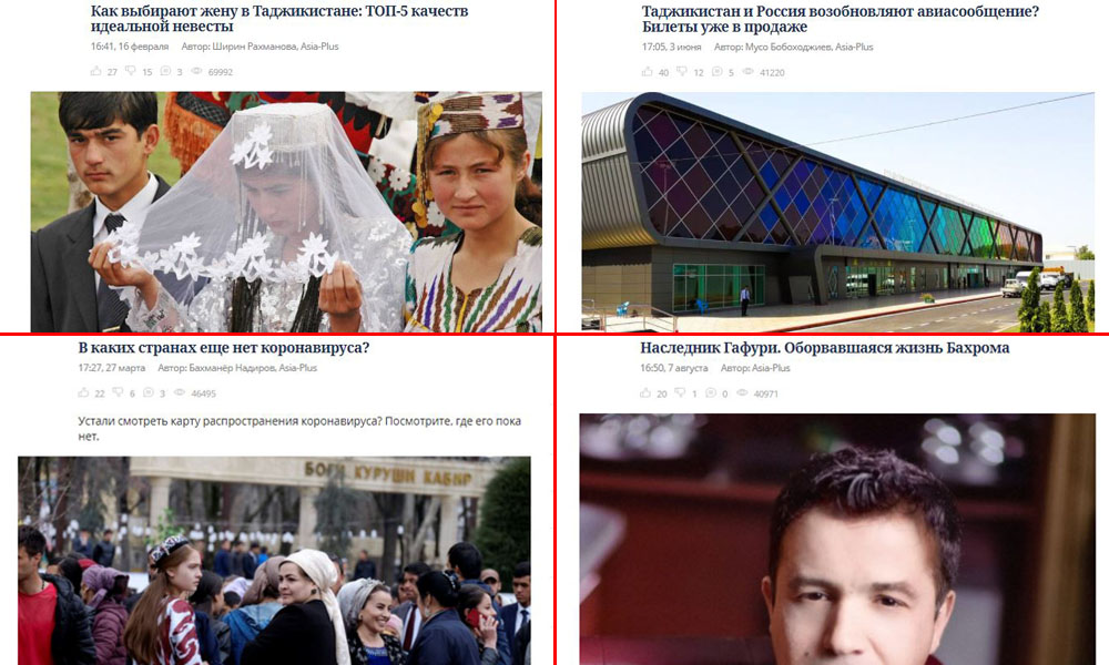Несмотря на блокировку нашего сайта и недоступность главного домена, в 2020 году на сайте «Азия-Плюс» — asiaplus.news – было более 23,3 млн. просмотров, в среднем ежедневное число визитов на сайте достигало более 30 тысяч.