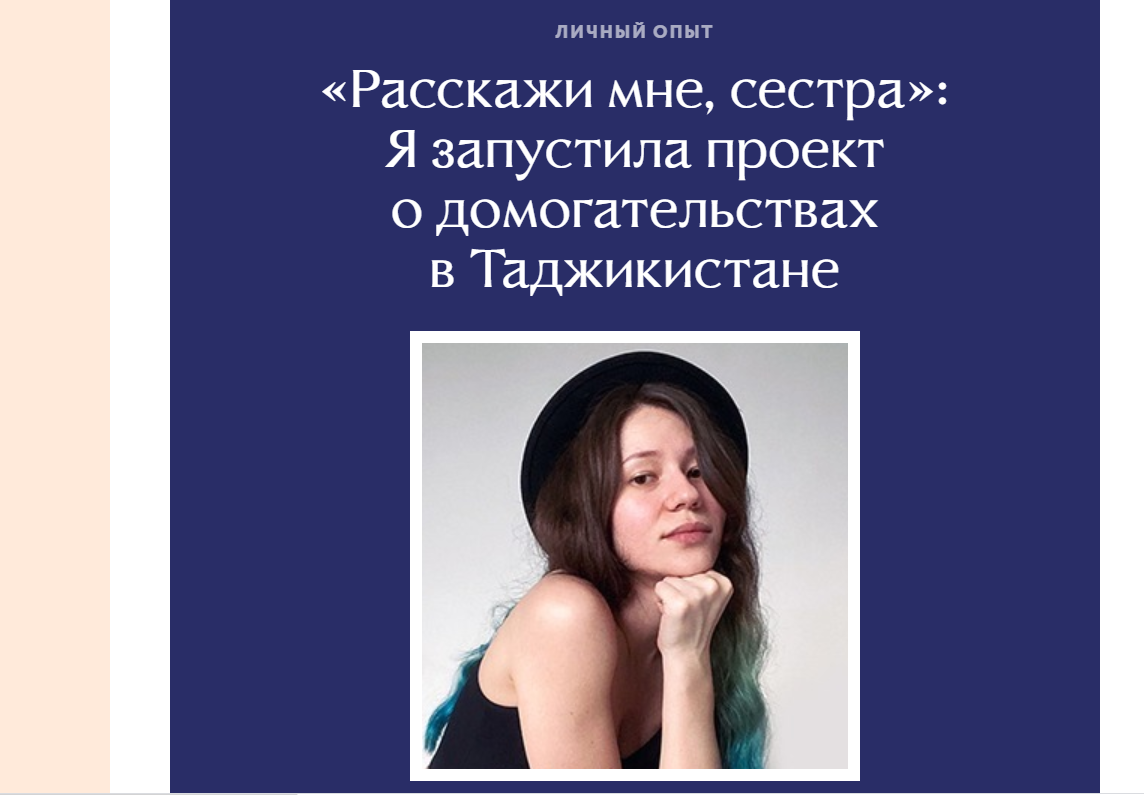 Впрочем, новая откровенность в этом году была не только в СМИ: в 2020 году в таджикском сегменте соцсетей появилось сразу несколько социально важных блогерских проектов. Пожалуй, самым ярким из них стал медиапроект Tell me, sister Елены Нажмиддиновой. Идея проекта такая: жительницы Таджикистана анонимно рассказывают личные и очень откровенные истории о том, как они подверглись домогательствам.