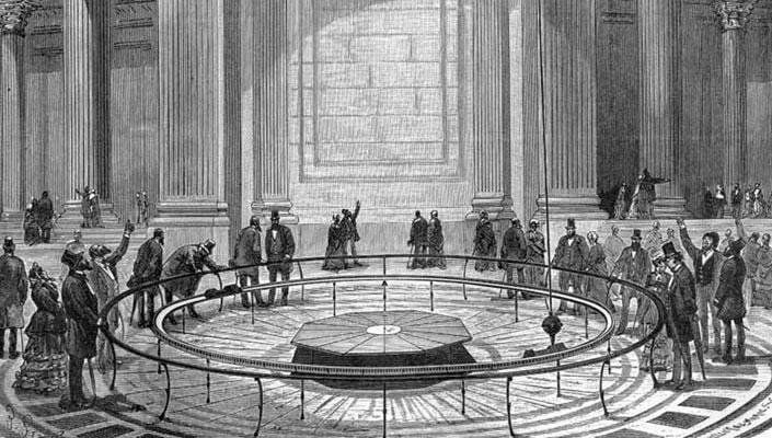 170 лет назад физик Жан Фуко, благодаря сконструированному им аппарату, получил доказательство, что Земля вертится. Он сконструировал прибор, состоящий из пятикилограммового шара из латуни, подвешенного к потолку на стальной проволоке длиной 2 метра.