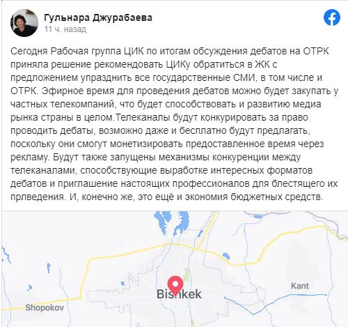 «Телеканалы будут конкурировать за право проводить дебаты, возможно, даже и бесплатно будут предлагать, поскольку они смогут монетизировать предоставленное время через рекламу. Будут также запущены механизмы конкуренции между телеканалами, способствующие выработке интересных форматов дебатов и приглашение настоящих профессионалов для блестящего их проведения. И, конечно же, это еще и экономия бюджетных средств», — написала Гульнара Джурабаева.