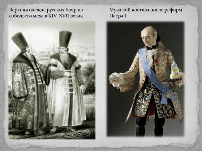 Бояре, дворяне и торговые люди должны были носить западноевропейский костюм. Жены и дочери их также должны были вместо русских сарафанов и телогреек носить юбки и платья по иноземным модам.